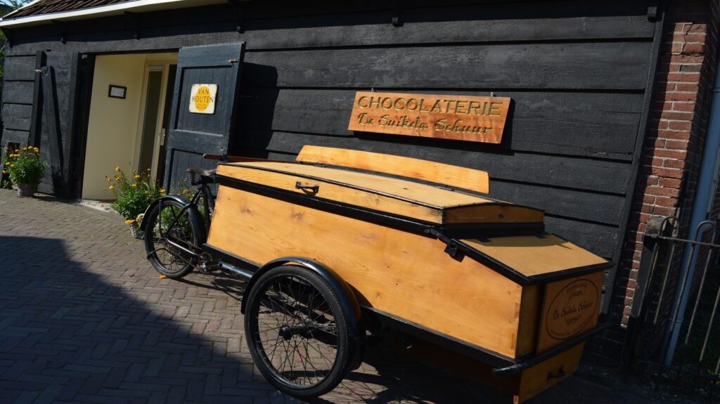 - Er op de achterkant van onze 300gr en 450gr huis doosjes oude foto’s van huizen staan? Op de bovenkant van de doosjes staat een foto van de winkel (en het huis) toen de schuur net gebouwd was (ca. 1920). Wij hebben de doosjes samen met drukkerij Bout ontworpen.
